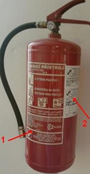 Jak správně použít hasicí přístroj je naznačeno na typovém štítku (1), který kromě jiných údajů (název výrobce, všeobecné informace, typové označení, hasicí schopnost) obsahuje i piktogramy, které naznačují návod na použití a dále piktogramy informující na jakou třídu požáru je vhodný a co se s ním hasit nesmí.